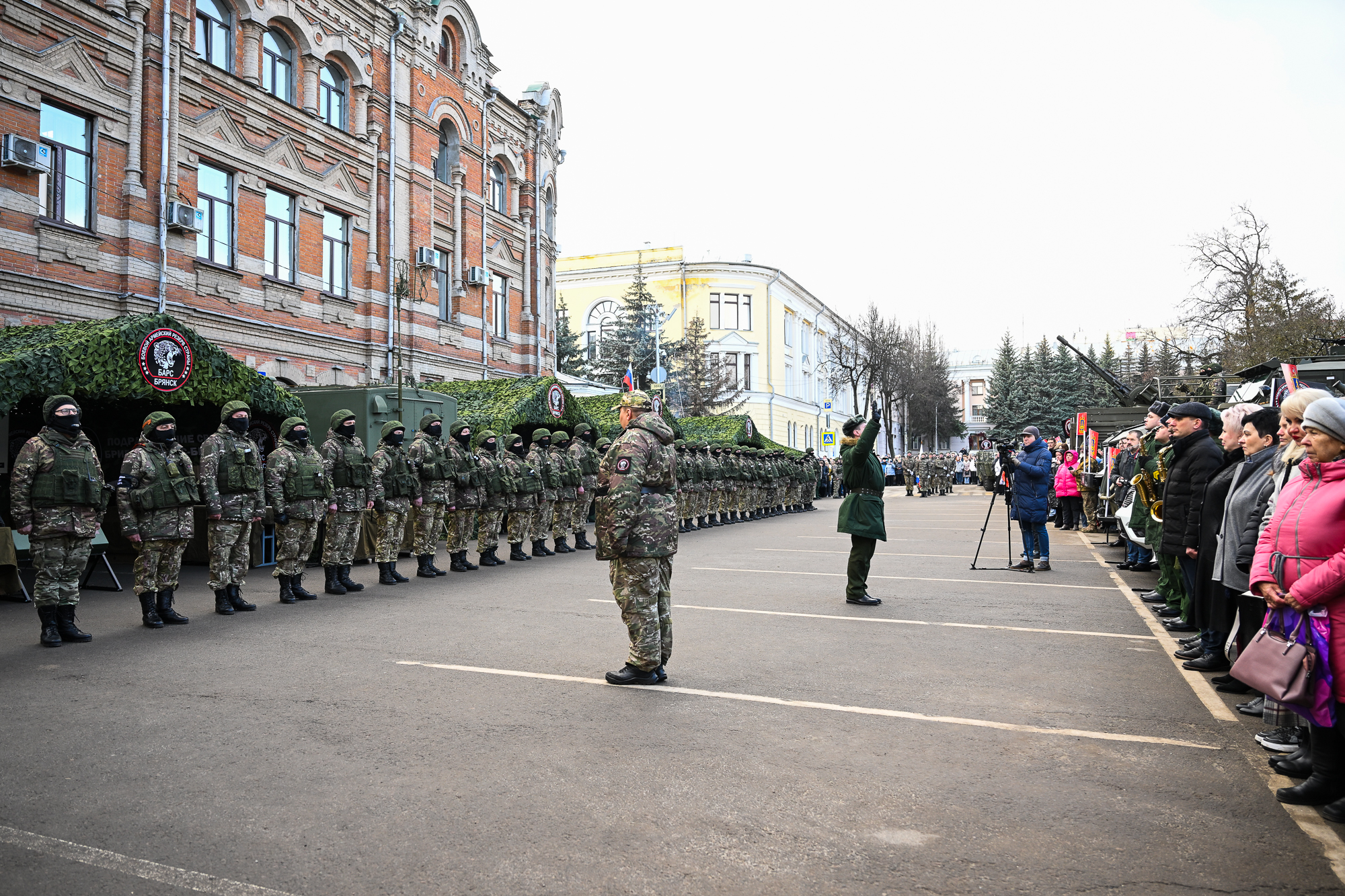 Хочу приветствовать присутствующих здесь несколько тысяч человек – жителей города Брянска и области. В строю бригады «БАРС-Брянск» ваши родные и близкие. Спасибо огромное вам, спасибо огромное героическим женщинам, которые повторяют подвиг тружениц тыла в Великой Отечественной войне. Сегодня швейбаты плетут маскировочные сети, шьют куртки, носилки, балаклавы и многое другое, что согревает на передовой и в зоне контртеррористической операции тех, кто защищает нас с вами от врага.