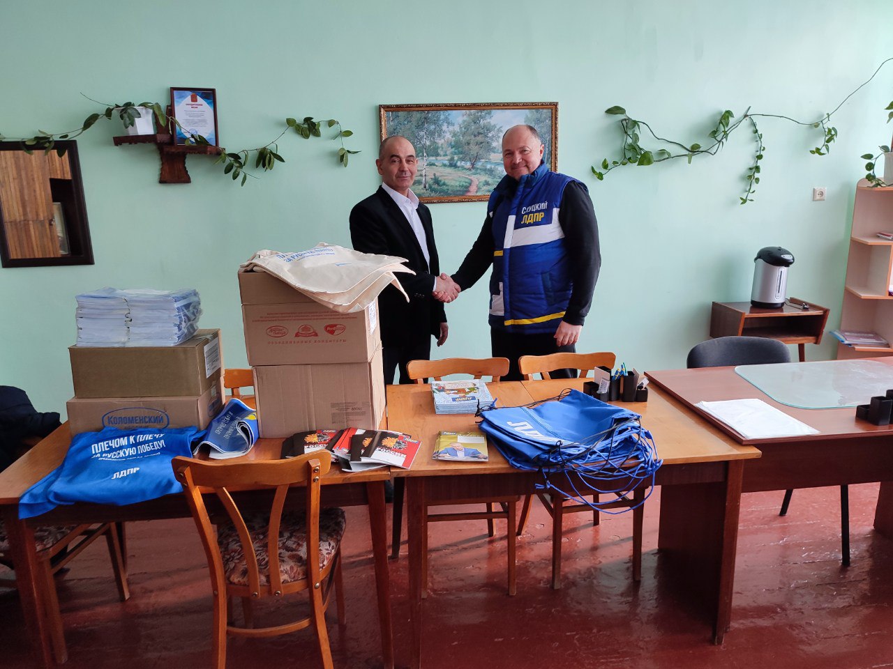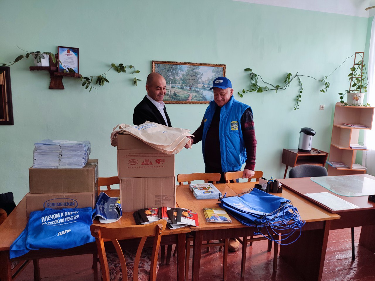 Представители партии Жириновского прибыли в школу не с пустыми руками. Они привезли с собой сладости, рюкзаки, литературу и канцелярские товары, что стало приятным дополнением к общению.
